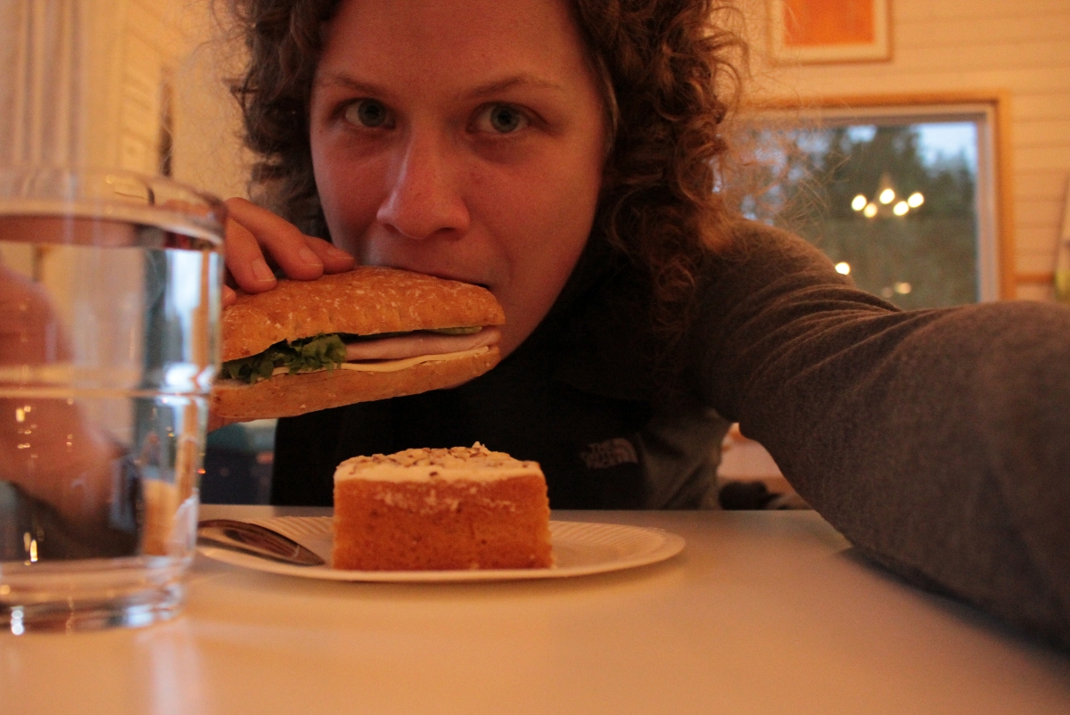 | Cheese-and-ham sandwich, carrot cake, and tap water. Oh sweet victory, you taste so good. |